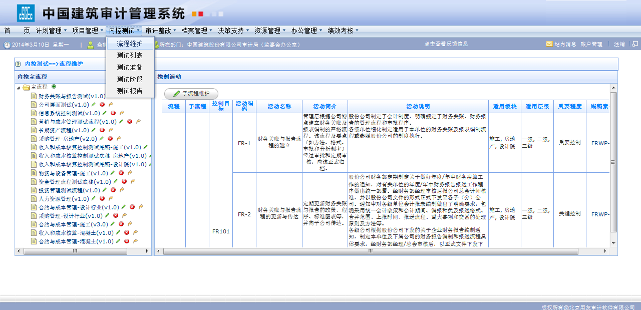 ■ 內控評價模塊是審計人員開展內控測試工作的平臺,嵌入了公司有關內控評價規范與標準,建立內控測試知識庫。自動實現公司內控量化評價、展現公司的風險分布,并出具相關統計匯總表。